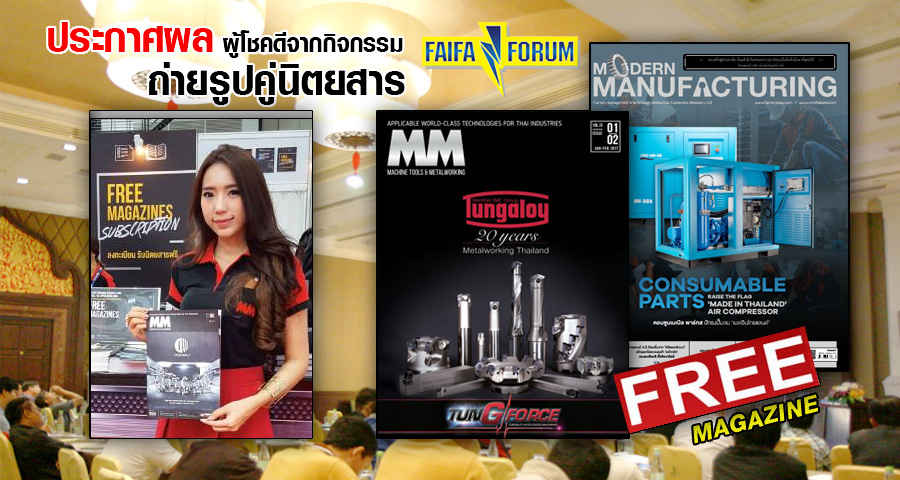 เมื่อวันที่ 7 กุมภาพันธ์ ที่ผ่านมา ทาง TIF จัดงานสัมมนาและแสดงสินค้าอุตสาหกรรม FAIFA Forum 2017 ณ โรงแรม กรุงศรี ริเวอร์ จ.อยุธยา ซึ่งภายในงานได้มีแจกนิตยสาร MM Machine Tools & Metalworking และ Modern Manufacturing ฟรี !! พร้อมกิจกรรม ถ่ายรูปคู่นิตยสาร ให้ผู้เข้าร่วมงานได้ร่วมสนุก ลุ้นรับของรางวัลกัน โดยผู้โชคดี สำหรับกิจกรรมในครั้งนี้ ได้แก่ …